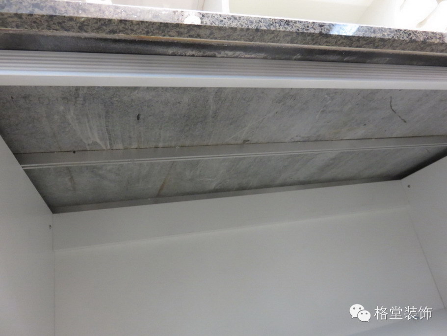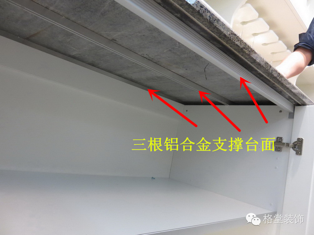橱柜下面全部用三根铝合金垫板,支撑在台面和柜体中间,承重受力均匀.质保5年,任何开裂或者出现问题,免费更换,但是一般不会有问题,质量严格把关。