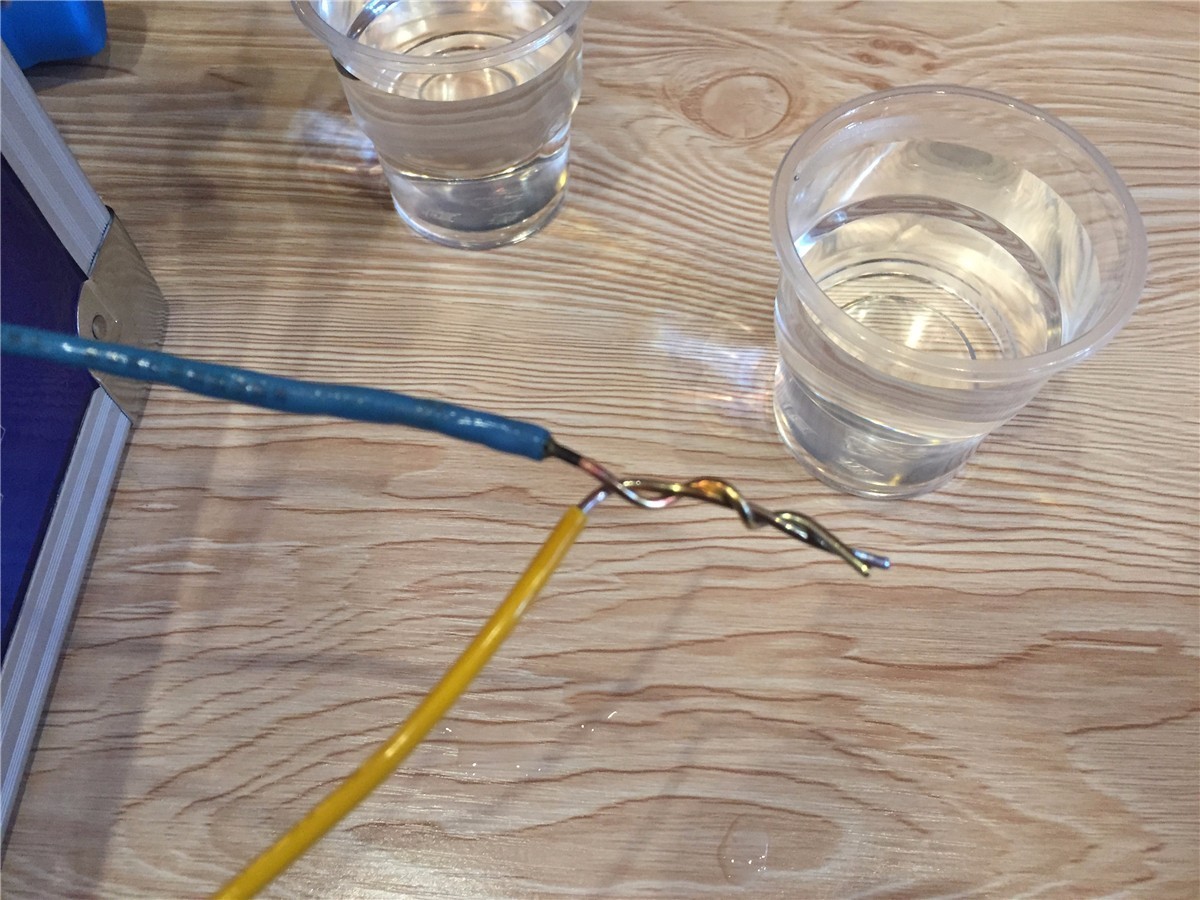 又过了会儿,我们发现蓝色铜线底部已经焦黑,PVC绝缘层也逐渐膨胀走样。而中大元通电线除了表面有一些热气,毫无变化!