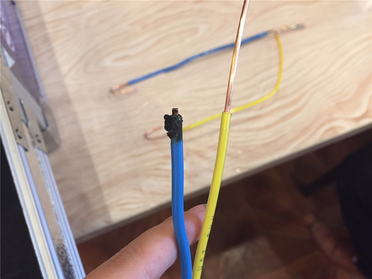 蓝色的是一般普通电线,黄色的就是中大元通电线。实验没过多久,蓝线已经开始冒白烟了,同时散发出一股烧焦刺鼻的气味。