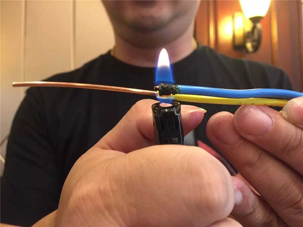 我们再用打火机烧烧看▼ 很快,普通电线就被高温火焰烧焦了!就是这么触目惊心!