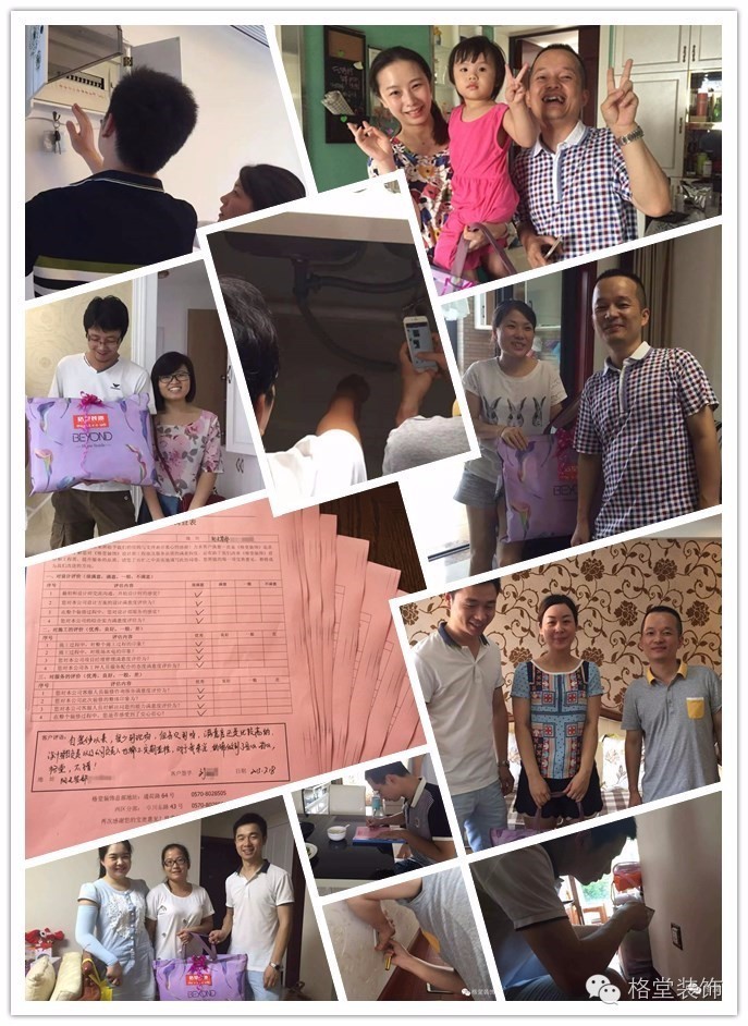 客户回访 2016年格堂感恩回访 格堂服务永远在身边! 我们率先扛起了衢州家装行业贴心服务的大旗,开启以「服务至上 携手成长」为主题的客户大回访活动。装修靠的就是客户口碑,口口相传,要想客户口碑就必须有满意的设计和施工。感谢在格堂装修过的客户,因为有你们,我们才有了如今的骄人业绩,因为有你们,我们才把工程遍布到了衢州的各个地方! ▲格堂通荷路店