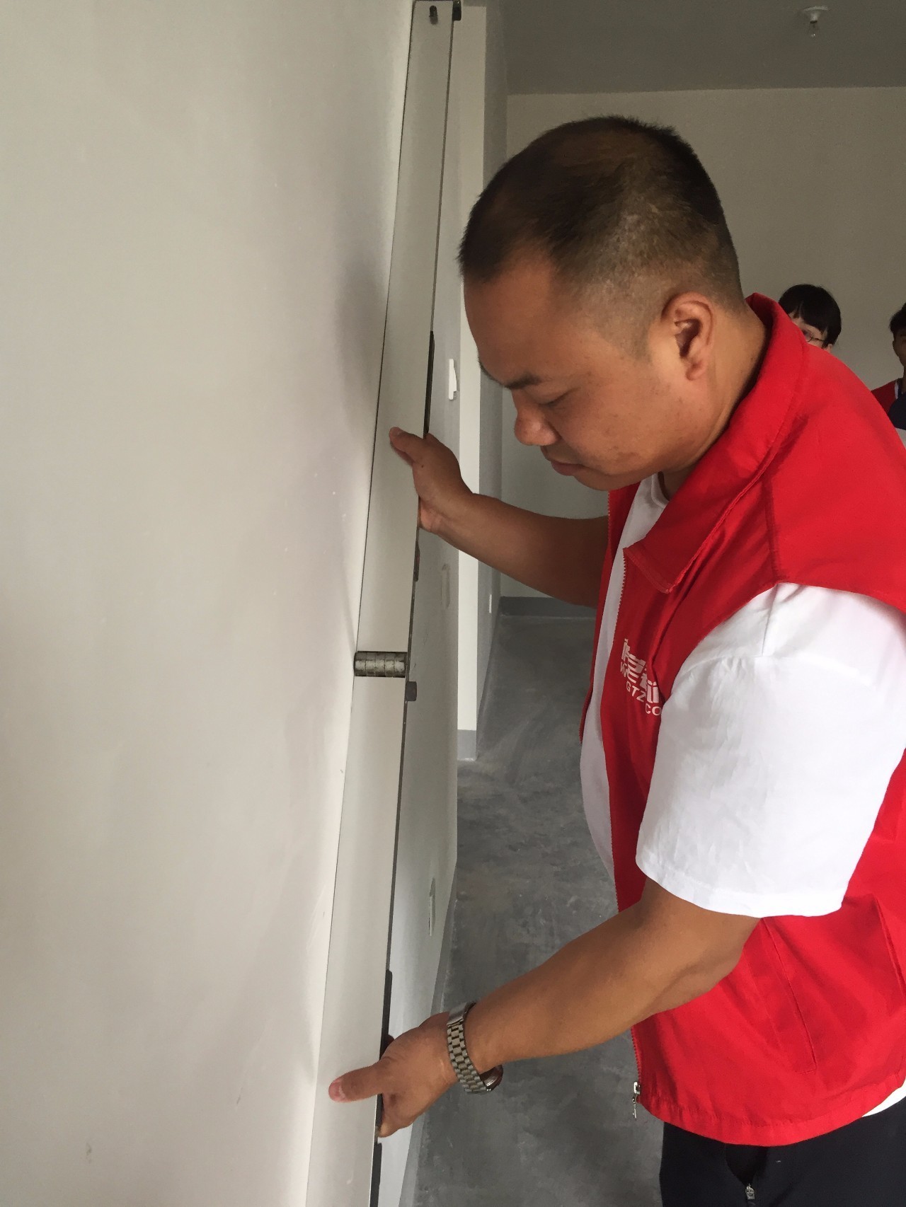 格堂装饰工程部一部项目经理队长余工作了专业的验房示范,360度不留死角,专业到位,一起来学习下吧! 余工从事装修行业23年 在我手上验收的房子已经超过上百套了 施工上有非常丰富的经验 验房检查非常认真仔细 我们跟随余工一起来体验如何验收房子吧 检查门锁开关是否正常、门是否有掉漆,铰链运作是否正常。