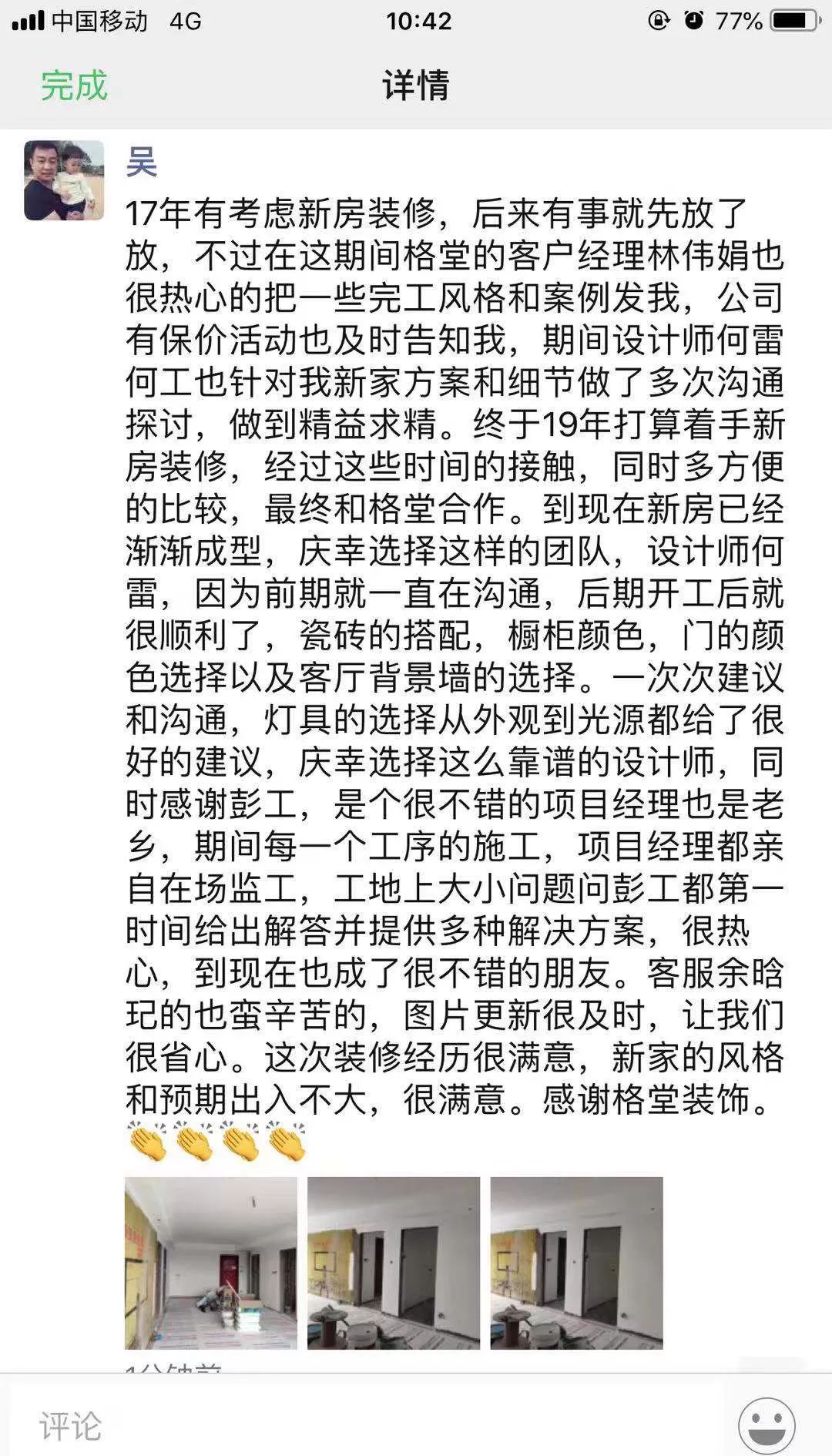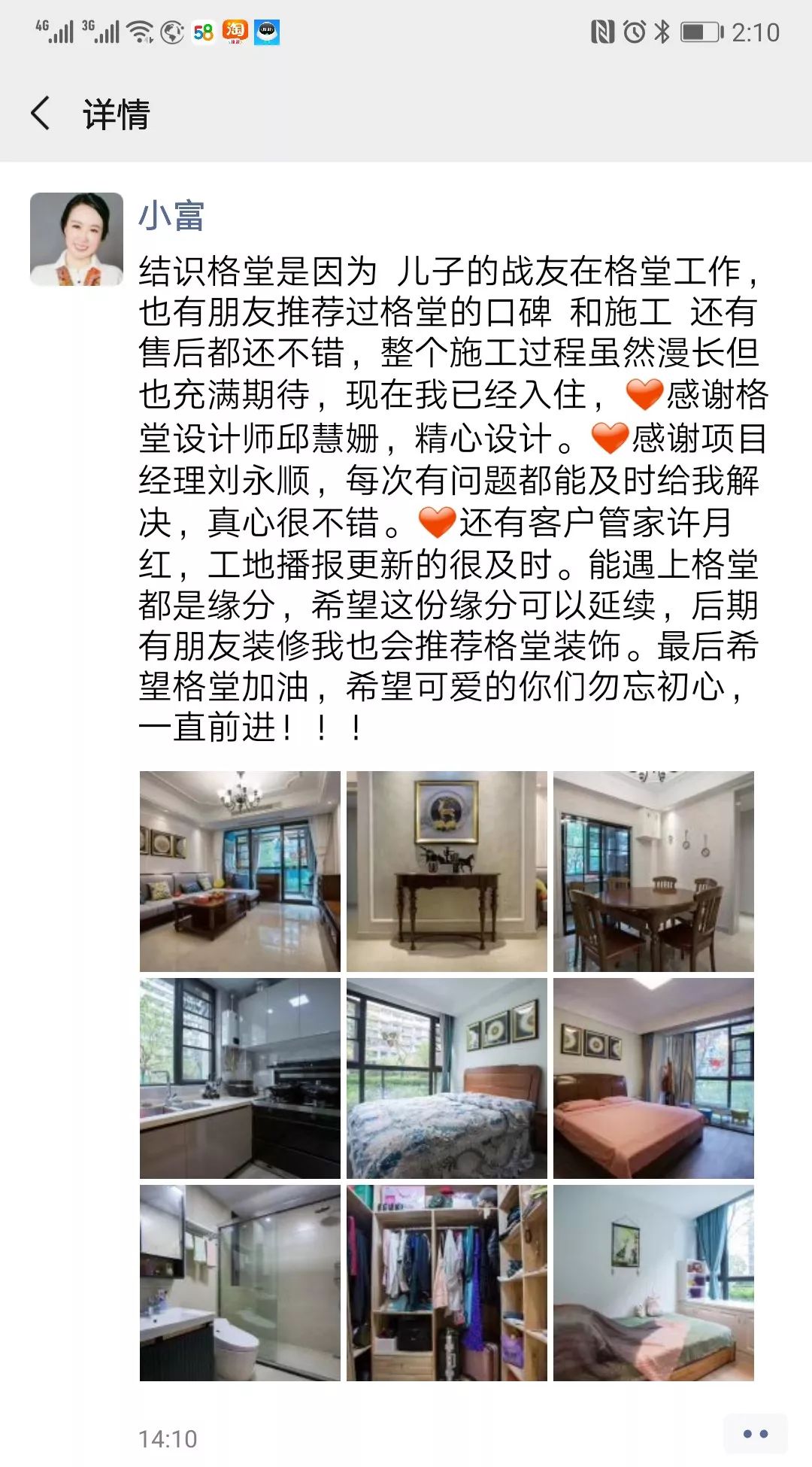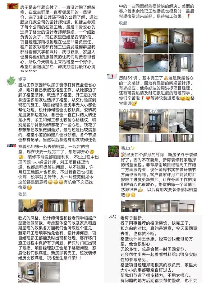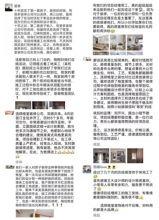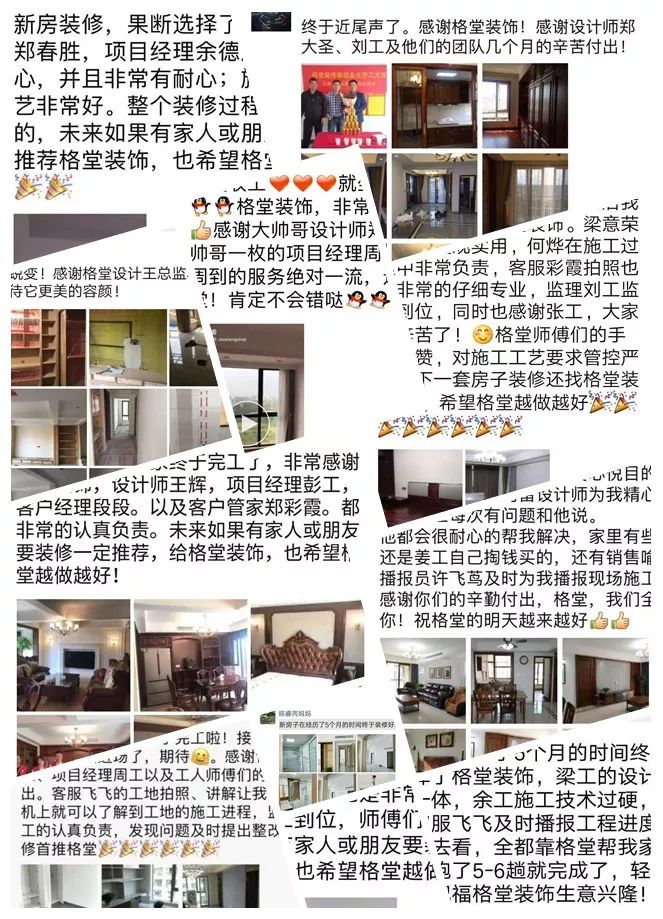 金杯,银杯,不如业主的好口碑!选择装修公司的标准:看一个装修公司有多少个好评!一个装修公司有多少个完工照!其它一切都是空谈...... 经过十几年的发展,装修行业从低门槛的阶段发展到标准化进步。市场的事实证明,传统的电话营销非常扰民,疲劳的电话轰炸只会引起客户的反感。还有些公司喊口号型,对外宣称自己是最好的什么,最牛的什么,没有实际的数据体现真正的实力,最后的结果差强人意。 格堂装饰一直有前瞻性和大局观,很早就顺应装修行业市场变化。我们抛弃传统营销驱动型,一直坚守价值创造型的方向发展,坚守 “客户口碑” 的核心发展战略。  客户口碑在家装行业一直具有举足轻重的地位,甚至比花钱打广告的传播效果更好,更深入人心。 13 年来,数千名业主共同选择了格堂装饰,一同见证了我们的发展与成长。因为产品和服务的体验感好,老客户也非常愿意分享给周边的朋友,这就是格堂的客户口碑。 我们目前的客源里,80% 左右都是来自老客户的介绍。客户是我们最好的广告,做一套漂亮工地,并拍好完工照,是我们格堂的骄傲。得到客户的好评,是我们格堂人的能量源泉。有好的口碑才会有好的影响力。目前,客户满意度已经列为格堂装饰的硬性考核指标,必须要有 100% 的客户好评!