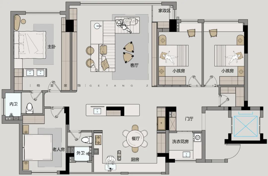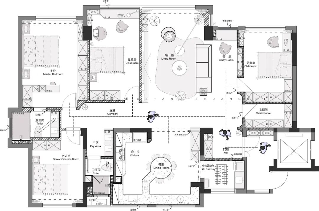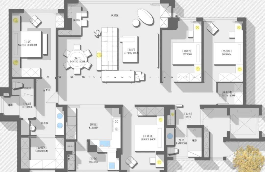 第一届格堂装饰2025户型优化大赛 本赛事聚焦星月宸庐167㎡顶楼户型,参赛设计师们同做一个户型,结合家庭人口结构和生活场景需求进行户型优化设计,空间意向图、空间模型、效果图、手绘图均选做。 我们将综合考量每个设计师的平面户型优化能力,核心聚焦于户型方案的创新性、可行性、完整性、审美性等诸多方面,设立金奖1名、银奖2名、铜奖3名、设计助理第一名,表彰具有卓越户型优化感的设计方案! ![]() 大赛内容 大赛户型 ![]() 客户模拟 业主:企业总裁 设计需求: ① 一家5口,一个老人房,两个小男孩,小孩房间都按初中生标准设计,小孩的房间大小基本差不多一样,任意风格都可以,每个小孩的储物衣柜长度1.5米到2米之间,每个小孩要有一个单独的做作业的地方,公共空间需要有一个共享的书桌,书房亦可。 ② 老人房最好是1.8米的床,平时住一个,偶尔会有两个老人,1.5米的床也可以接受,储物衣柜长度1.5米到2米之间。 ③ 主卫生间要双台盆,女主人衣柜要多,主卫的淋浴房宽度不能小于1.1米。 ④ 餐桌尽量用圆桌,需要有一个晾衣服的小阳台。 注意事项 建筑南面无敌景观,剪力墙不能动,飘窗可以敲;卫生间均有沉箱降板,方案需考虑下水条件,所有主立管井不能调整,厨房需要燃气开通考虑;入户大门可调整,电梯厅不可改动,只能放鞋柜。 ![]() 1月17日周五晚 第一届格堂装饰2025户型优化大赛总决赛 群星闪耀,并驱争先 经过激烈的海选比拼 ![]() ![]() ![]() △设计师组 ![]() △设计助理组 本赛季12强选手已经产生 最终迎来总决赛收官对决 共襄这场设计竞赛的狂欢 ![]() ![]() 冠军之夜!巅峰对决! 12强选手们带来了精彩绝伦的户型优化设计方案 每一套设计方案都充满了创意与惊喜 冠军又将花落谁家? 让我们拭目以待! 吴杭丽 事业一部 ![]() ![]() 我的设计主题,家是温暖的港湾,它不仅仅是一套房子,更是一种情感的寄托,在这里可以感受到无尽的关爱与温暖,也可以体验到生活的美好与幸福。 入户电梯出来后,我将原先南北朝向的入户门改成了东西方向,原始入户门处做了鞋柜。这样电梯出来能直接进到入户玄关,我将玄关设计的十分大气,南北通透,采光极好,边缘也做了弧形的造型设计,第一印象撑起了这个家的门面担当。 玄关往右是一个储藏间的设计,业主并未提出这一功能需求,但我还是设计出来了,因为实际生活中,大件的行李箱、落地扇以及生活用品,都需要一个储藏空间进行收纳规划。 根据业主需求,我设计的两个男孩房房间一样大,都是1.5米的床,都配备了书桌,书桌也都靠窗,整体采光通风都很不错。 外卫干湿分区设计,淋浴房和智能马桶使用舒适,空间足够还设计了壁龛,扫地机器人也能合理添置在这里。 客餐厅是一个大横厅的设计,中间以电视背景起到隔断作用,既保持了相对独立,又通透联动。餐厅满足了业主想要的圆桌,一家人围坐在一起非常温馨。阳台一隅设计了一个书房大板桌,也是家人们办公学习的极佳场所。 父母房考虑到有些时候1到2人住,还是放置了1.8米的床,书桌靠窗,父母的营养品、保温杯等生活用品,便都有了摆放位置。 考虑到家庭居住人口是比较多的,厨房设计的很宽敞,包含了嵌入式冰箱和常用的厨房家电,整个厨房动线合宜,和客餐厅也有很好的联动。 主卧大套间设计,主卫1.1米淋浴房成功安排,双台盆1.5米,使用上也很舒适。走入式的衣帽间,一体的书柜兼梳妆台设计,日常化妆和临时加班都能兼顾到了。 独立的洗漱阳台设计在北面,空间也比较大,洗衣机、烘干机、晾晒功能齐全,都能满足。 ![]() ![]() 杨波 事业二部 ![]() ![]() 入户电梯出来后,我将原先南北朝向的入户门改成了东西方向,原始入户门处做了鞋柜。因为是一梯一户的户型,鞋子都可以在门口进行一个更换。 进门后是一组承重墙,恰好做成玄关柜,墙这边弧形的造型跟过来,刚好兼顾到这里的两根包管。柜子没有一面全做,两根包管处可做灯光或造景,形成巧妙的断层效果。 因为家里有老人,生活习惯都更倾向于有晾晒的,所以晾晒的空间需要考虑到。玄关左侧原本是一个卫生间,我改做成了洗衣房,仍然保留了原始落地窗的通透性,没有另做柜子和储物,尽量让洗衣房显得大一些。洗衣机、烘干机、水池、扫地机器人等都可以放这里。洗衣房的门是玻璃移门,要用透光不透景的做法,不影响视觉上的美观度。 原始户型是一个4个卫生间的户型,因为是顶楼,上面没有下水管,我便将朝南的这个卫生间取消掉,连同边上的房间一起,隔出了两个男孩房,两个房间面积差不多。原来的这个房间,靠窗户是飘窗,并不是落地窗,所以拆除飘窗后,书桌摆放到窗边,这里会以升降帘为主。考虑到储物功能需求,角落里我还做了800库的设计。 客厅是一个双阳台大横厅设计,我保留了落地窗,这样靠南面没有任何遮挡,一整个无敌景观。侧边还有一个落地窗,也保留起来,做了一个美丽景观。现在并未考虑到电视这些,选择上很多样性,投影可以,电视也可以,电视不一定挂墙上,也可以是移动的。 因为原来阳台的位置,有根很大的梁,基本上不管怎么设计,这根梁都会露梁,很难用整个吊顶把它包掉,所以我把客厅往回挪,靠阳台这边放置书桌,做成一个亲子学习互动的空间。 餐厨一体式设计,因为冰箱位置的深度较深,我做成嵌入式冰箱设计,跟餐边柜齐平。因为厨房这边够大了,所以原先靠厨房的这堵墙