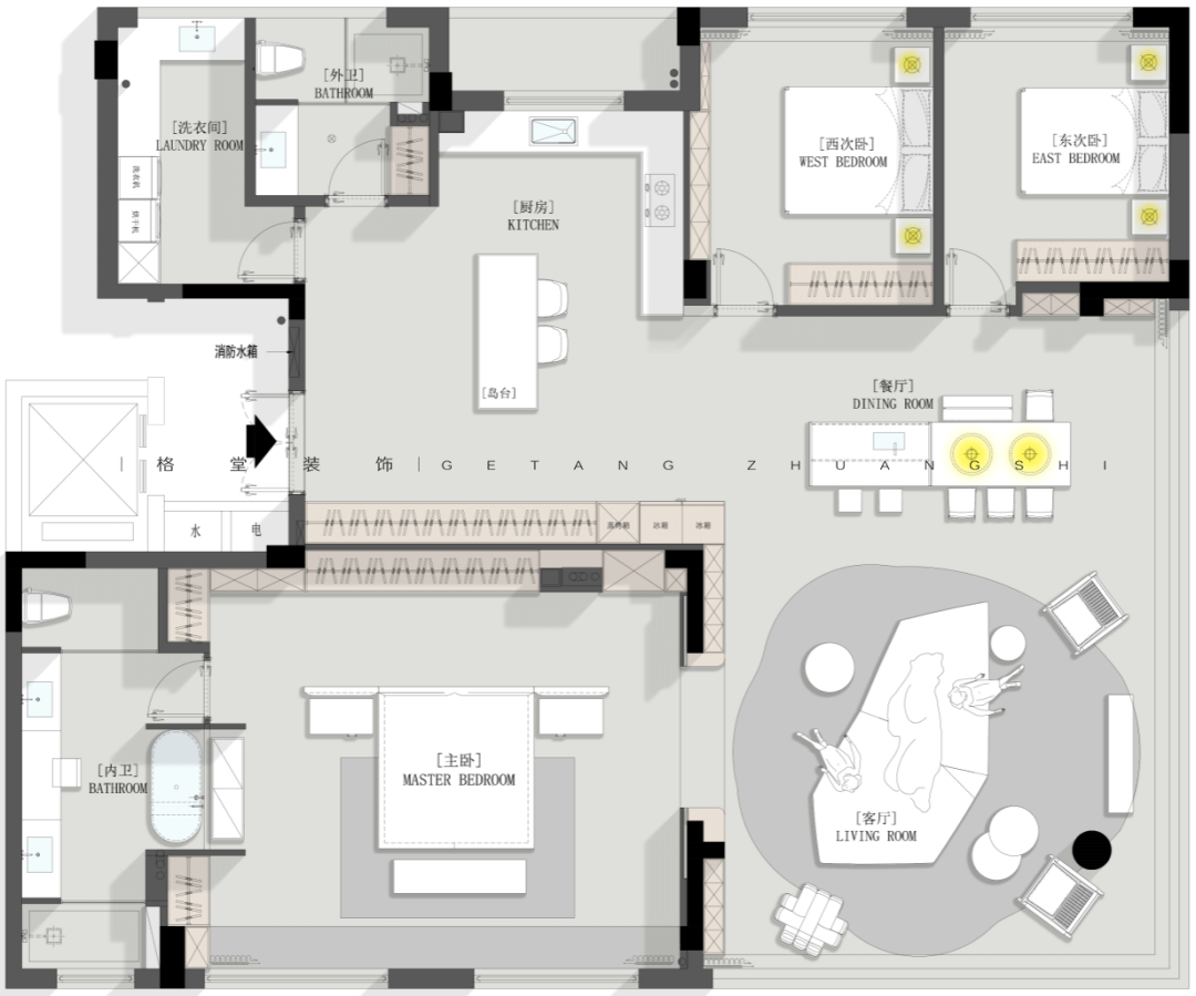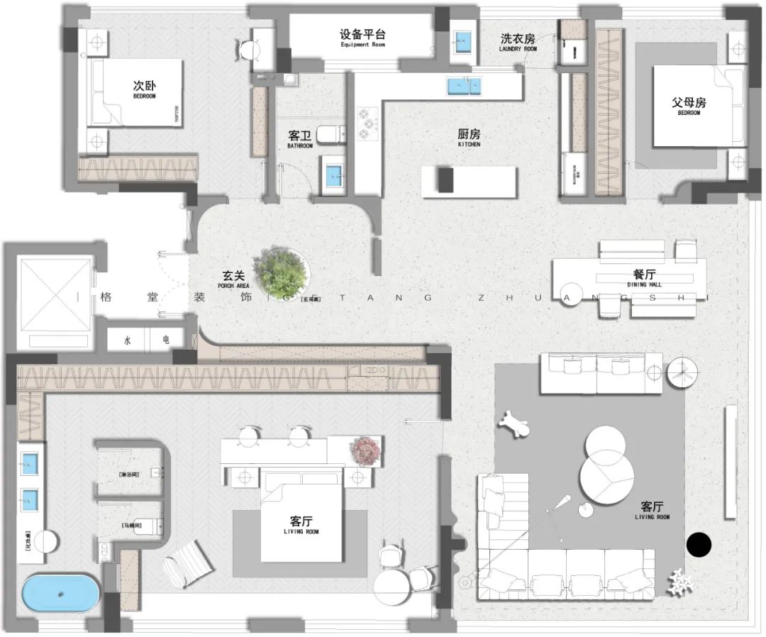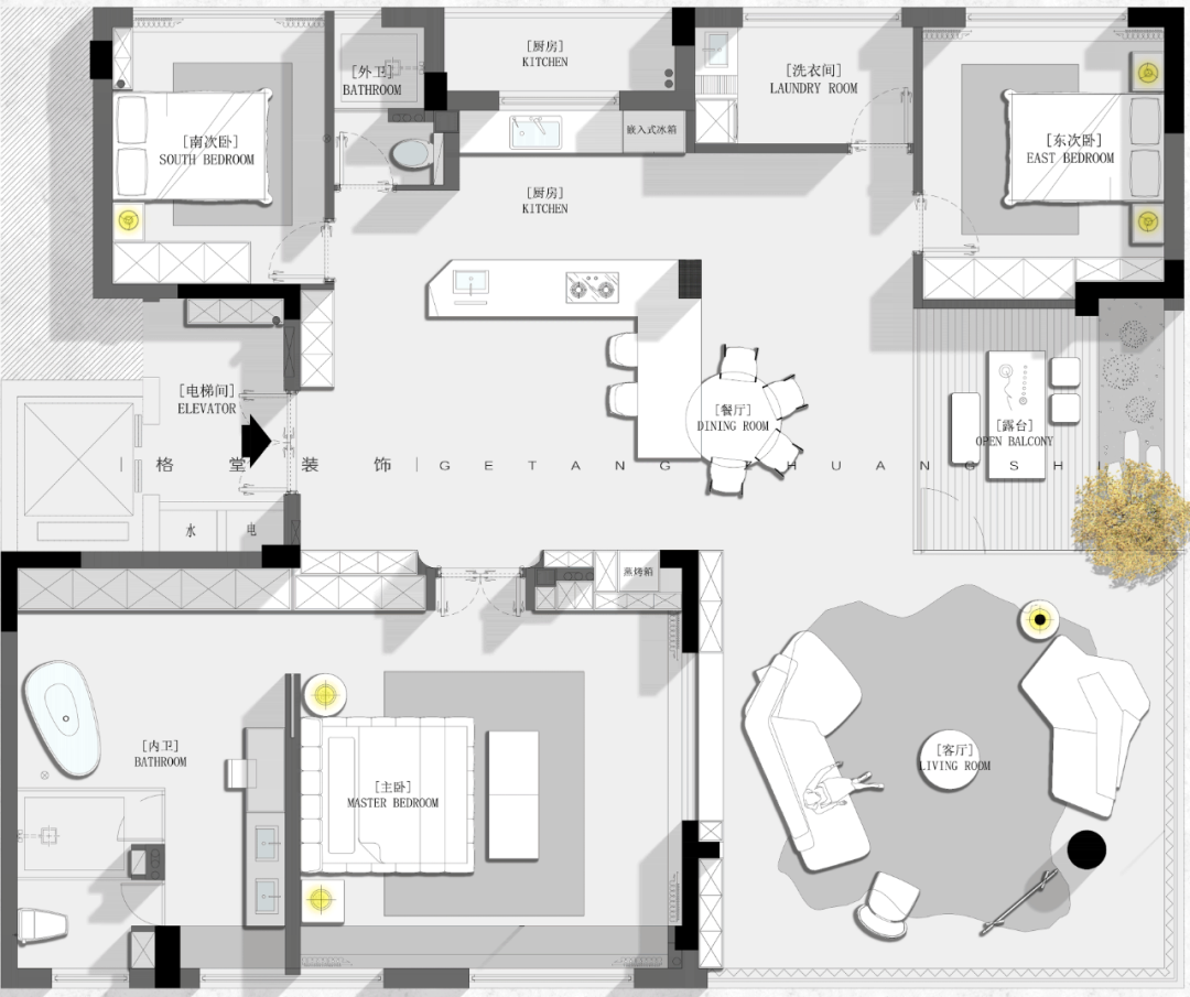 第二届格堂装饰 2025户型优化大赛 本赛事聚焦龙游江堤春晓212㎡大平层户型,参赛设计师们同做一个户型,结合家庭人口结构和生活场景需求进行户型优化设计,空间意向图、空间模型、效果图、手绘图均选做。 我们将综合考量每个设计师的平面户型优化能力,核心聚焦于户型方案的创新性、可行性、完整性、审美性等诸多方面,设立金奖1名、银奖2名、铜奖3名,表彰具有卓越户型优化感的设计方案! ![]() 大赛内容 大赛户型 ![]() 客户模拟 业主:小学老师 客户是一对刚参加工作25岁左右的年轻人,职业是小学老师,房子是父母给年轻人准备的婚房。 设计需求: ① 暂时装修好是年轻人自己住,但需要准备一个小孩房,还有考虑长辈房帮忙带小孩。 ② 客户希望房子设计要通透,体现出大平层的开阔。 ③ 需要有充足的储物空间,最好能有一个独立的洗衣间,不想在客厅洗晒衣物。 ④ 内卫要大点,想要一个浴缸,厨房需要岛台。 注意事项 房子的东面南面视野特别开阔,而且东偏北15度左右有江景,小区物业管理非常严格,设备间外扩、飘窗拆除都不可行,入户大门可微调,电梯厅不可改动,只能放鞋柜。 ![]() 7月30日周三晚 第二届格堂装饰 2025户型优化大赛总决赛 本赛季15强选手已经产生 群星闪耀,并驱争先 共襄这场设计竞赛的狂欢 ![]() 冠军之夜!巅峰对决! 15强选手们带来了精彩绝伦的户型优化设计方案 每一套设计方案都充满了创意与惊喜 冠军又将花落谁家? 让我们拭目以待! 徐美玲 大宅部 ![]() ![]() 户型分析,优点肯定是大,公共空间大,客餐厅大,主卧室大,那缺点也有,飘窗不能拆,设备还是不能扩的,很多条件都不允许。原始户型来说,厨房其实是偏小的,然后三个卫生间,两个外卫,一个内卫,它内卫其实够大,但中间这个卫生间实际是个暗卫,也不是特别舒服,包括它的尺寸也是偏小的。 当初做方案的时候,我也在纠结三个房间,都放在哪个地方,卫生间要做几个,到底保留哪一个卫生间?客餐厅基本不变,中间一个大门厅,考虑把厨房扩大,房间分三个角落安置,主卧朝南,北边的一头一尾两个房间,尺寸差不多很公平。 进门有独立门厅,留了一组鞋柜,包括说进门洗手的生活习惯,所以把外卫放在了离进门更近的地方,干湿分区,台盆、马桶、淋浴房,外扩后也比原先的更大一些。 其中一个次卧就安排在卫生间边上,后续无论是小孩住这里,还是父母住这里,使用起来都更方便。 原始厨房太小了,就考虑把厨房打开,这里还有根承重柱,刚好客户说需要一个岛台,所以把岛台跟承重柱做一个巧妙结合,整体厨房扩大。这一侧是操作空间,另一侧全部做成一个高柜、电器柜、冰箱柜,这样厨房的日常使用完全足够了。 厨房上面做了一个独立的洗衣房,以中国人习惯来说,可能还是想要能晒衣服,而不是全部依靠烘干机来操作,尤其是小孩子的衣服,父母更愿意多让小孩子的衣服拿来晒一晒。 门厅进来后的这一块,一个烟道一个管道都不能动,还有承重墙,当时真的很头痛要怎么办?我就干脆中间做了一块抬高的造景,北面做展示柜收纳柜,南面做一个储物室。这样无论是小推车,婴儿车,还是很多杂物,都有了收纳之所。 同时自然形成了洄游动线,现在整个的公共空间,包括门厅、厨房、餐厅、客厅、书房,都是非常开阔舒适的。 考虑到业主是老师的工作性质,大部分都要有一个独立的书房,那就可以把两边的口袋门关上,形成一个独立封闭的空间,可以安静的学习办公。 因为空间还很充裕,我选择把餐厅和岛台分开来,这样功能相对区分,客厅并不是一个完全定义的客厅空间,还兼顾了休闲区的功能,整个空间打开之后,包括电视背景朝向,沙发的朝向,放在哪边都没问题,选择是很自由的。想休息的时候,可以直接打开口袋门,穿过书房回主卧。 主卧空间没有再去扩大,空间也足够了。主卫给它扩大了,提升使用的舒适度,一个单盆加超大梳妆台,一个大浴缸,淋浴房加马桶间。 ![]() ![]() 詹云彬 大宅部 ![]() ![]() 这是一个小的入户,右边有鞋柜,往后走空间变开阔了,不会显得很压抑。很多设计师会在大概两米多的位置,做一个遮挡的背景,但我没有这么做,我尽可能的把这个端景,考虑是一个雕塑,做到跟电视背景形成一个衔接,看起来非常大气。 再看一下方案的整体分布,三个房间,主卧保持原位置不动,这里空间挺大的,大落地窗视野也很好。西北角和东北角,各安排了一个房间。 玄关进来的左手面房间,有1.8米的床,衣柜和书桌都有,方便小孩使用。 厨房有一个高柜一个酒柜,中间利用这根柱子,做了一个实体岛台柜,双动线过来到了最狭长的位置,结合空间形状,没有放圆桌,而是放了一个长桌,同时花坛放在这边,空间虚实都有了,流动性很强。 靠南面,原来是一个房间加一个卫生间,我把这个房间取消了,原来的暗卫没有窗,现在整个打通过去,把窗户利用起来,多出来的空间全部归到主卧里面,让主卧更大。外卫做了干湿分离设计,离两个次卧的距离都很适宜。 主卧门进来有两排衣柜,储物空间丰富。床没有按传统方向摆放,因为客户是年轻人,并且窗外面是比较好看的江景,所以就把床对着窗户了。原主卫布局不是很好,后期重新设计过了,移门进来,一个大浴缸,一个超长浴室柜,淋浴房和马桶间各自独立。 东北角的次卧,也是功能齐全,主要是把洗衣房放到了它的下方位置。 客厅仍然按照传统方法布局,有L型的一个大